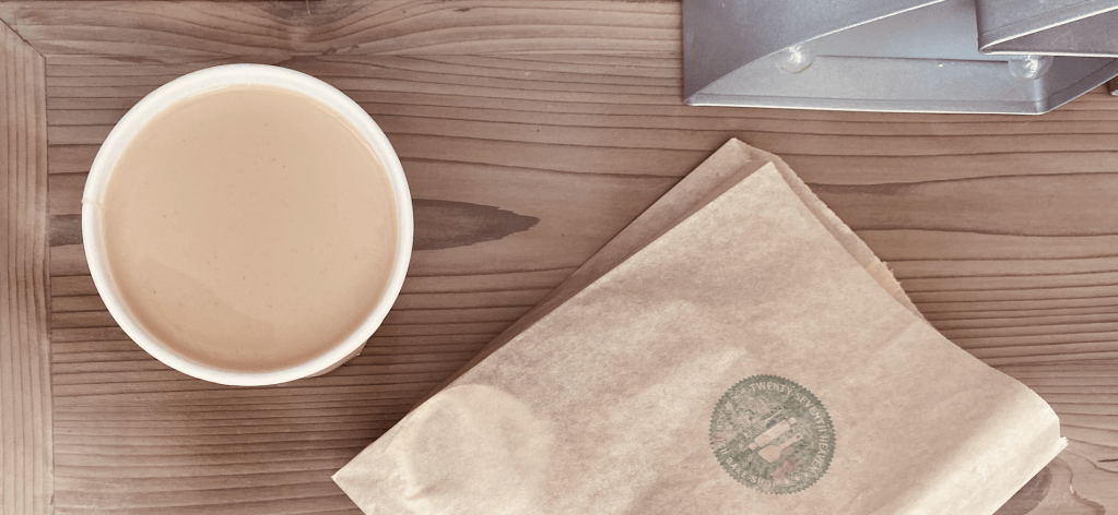 We settled on the drip coffee (they also serve decaf, chai, tea and matcha) which was smooth and dry, perfect with a touch of cream. We couldn’t resist a bagel, so tried the “oat honey” which tasted like a nice wheat. Looking around, the light wood compliments the welcoming gray and green. Altogether the place feels like a deep breath, exactly what we needed.