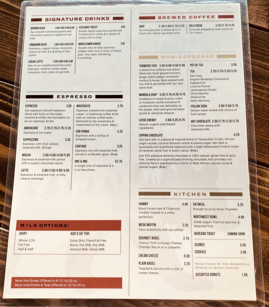 We sat down and noticed the Jackson Kiddard quote mentioned above on a sign. It is a nice reminder that also shows the heart of the place. We plugged our computers in the outlets (mostly at the end tables or benches) and the wifi password was “ilovecoffee” if you want to give it a try. If you run cold, be sure to grab a jacket (this also helps if you are sitting at the communal table as it is just a bit tall for the chairs and creates an awkward angle for the arms while typing). If you do not want to come in, there is an online order and pick up situation which is convenient, but beware of the limited parking lot and busy road adjacent to it. There is also a fridge full of grab and go food options which can be good in a hurry (which we too often find ourselves in).