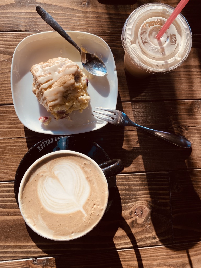 We found a menu on a table and ordered a nitro cold brew with mint & a slash of almond milk ($3.25 for a 12 oz, great price!) and an almond milk latte with mint ($4.5 for a 16 oz respectively). Both were delicious (although the nitro did have ice in it which watered it down a bit as it melted) and we will not apologize for our love of mint. Oh and don’t forget one of their pastries to go with your coffee, we definitely did not. They only have a few options; the orange-cranberry scone we shared hit the spot with our coffee (after finding the table of plastic straws, cutlery, napkins), but was a tad dry.