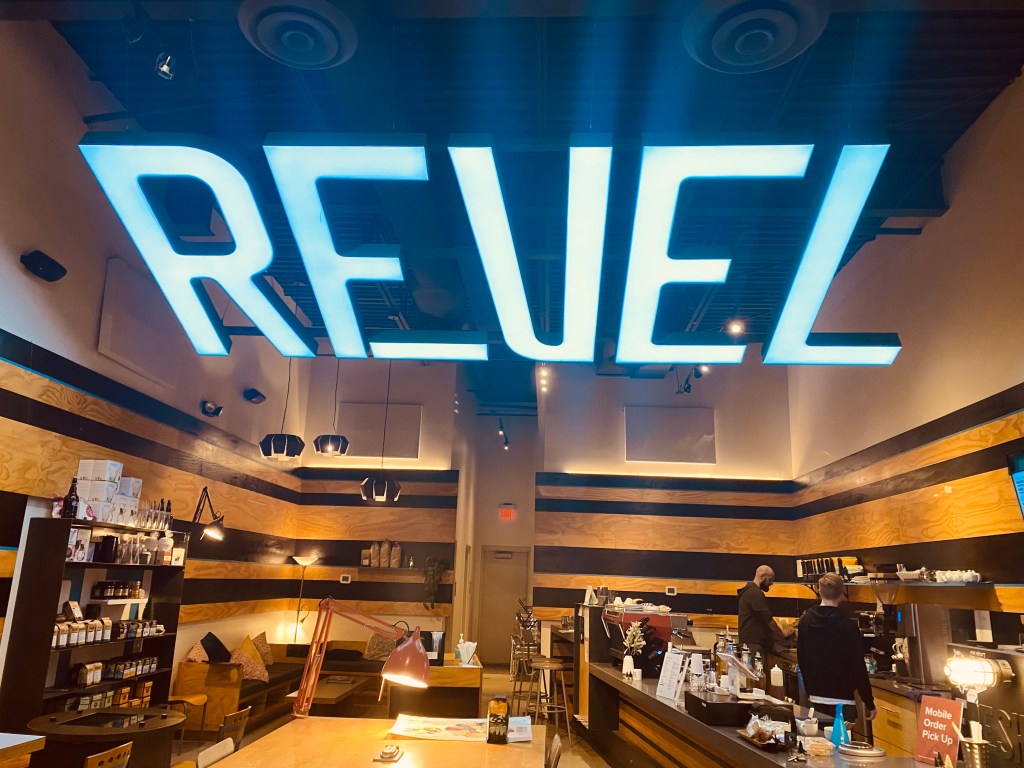Revel 77 is located at the end of a strip mall, but walking in feels like it could be a million miles away. It is a blend of wood, teal and a large Revel sign. There is a lot of seating with some lining the walls, a couch in the back, a center long table and seating outside. All of it looks like some brilliant carpenter built it just for this place. We have sat in all of these areas by this point, but always hope for the couch.