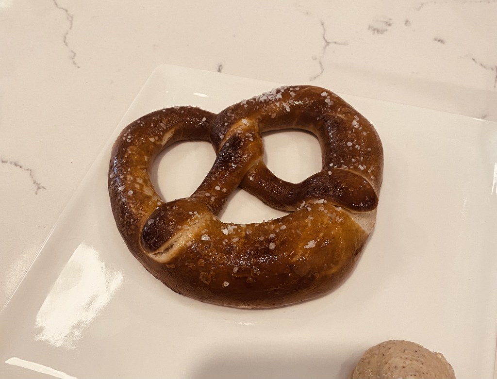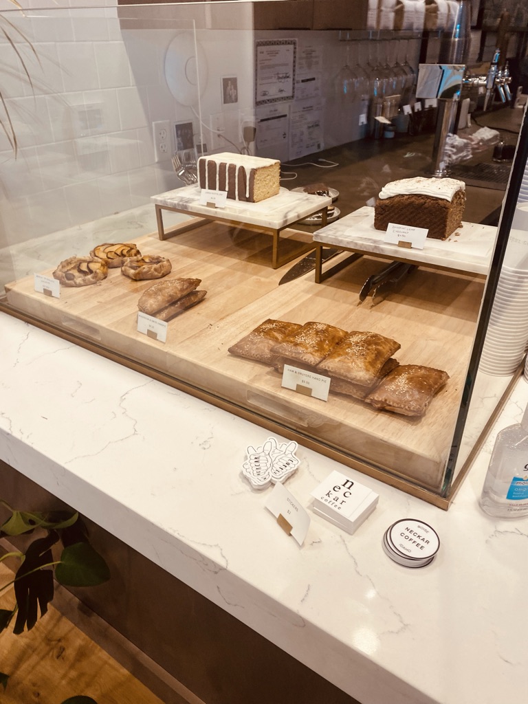 When I arrived I was greeted by kind baristas that took my classic question “what do you recommend?” in stride. I was even pleasantly surprised as the barista asked me about my preferences before making a recommendation. As you readers know, I prefer a slight creaminess and hint of sweetness to my coffee that brings out the flavors of the coffee itself instead of drowning them out. The barista recommended the mocha, which is often not my go to due to the sweetness, yet I couldn’t help but try it as the barista explained that it isn’t sweet in the typical way and has a chocolate flavor that brings out the even creaminess of the coffee itself, and I couldn’t agree more. It was $5.25 for a 12oz which is a little pricey, but worth the quality of the drink in my opinion. I would describe the flavor of the mocha as more of a cacao flavor than a milk chocolate, which is perfect for my taste. It provided enough of a bite to awaken my taste buds while smoothing them over with creaminess. In regards to food there are multiple pastry options which look delicious, and there is even an option for a pretzel! After seeing this I just had to get it, and I gotta say the $6 was worth it. The pretzel is made out of sourdough which I am personally a huge fan of, it was crunchy on the outside and soft on the outside, and was brushed with actual salt flakes. It was served with a tart mustard on the side but unfortunately no soft cheese (a personal preference) but overall delicious. The downside to the food is there is not an assortment of full meal food such as sandwiches or salads and such. Although another cool aspect to this shop is that they offer both beer and wine, for when you want to have a chill drink with friends or maybe that coffee just isn’t strong enough to get you through the tasks you want to accomplish on a given day.