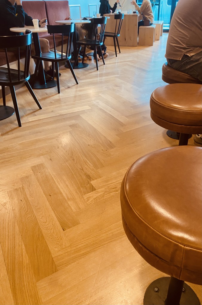 The coffee shop is sparse in other details of the space but this allows for a less busy and distracting atmosphere. As you walk in you are met with smooth jazz playing overhead as you walk up to a white marble countertop that extends down the length of the barista station to provide a wide and open bar accompanied by plush brown skinny barstools. Next to the bar the long wall is lined with a booth that opposites a single chair with a table in between them. In the front of the coffee shop there is a long block wooden table that allows a space for larger parties to sit. The space of the coffee shop in total isn’t very big, but the smart spacial planning provides multiple places to sit, mostly catering to those coming in alone or in pairs of two.