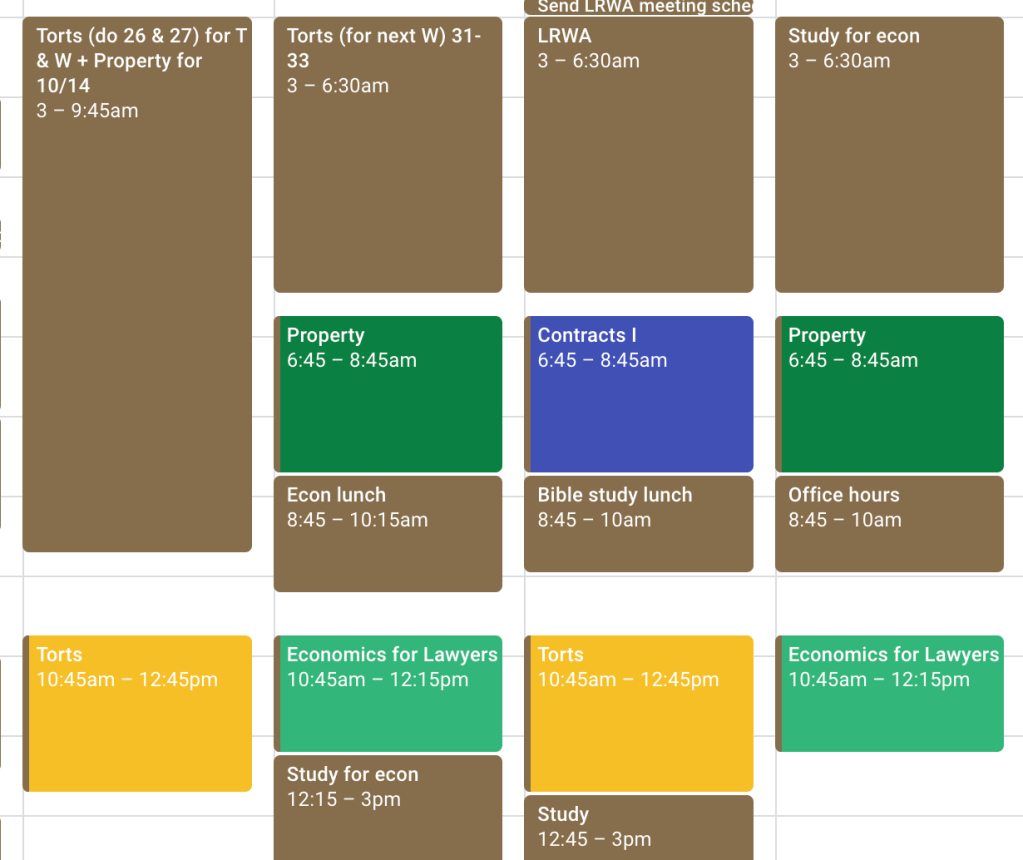 - Have other pursuits besides law school: I read this suggestion somewhere and promise it is true. Whatever you like to do and prioritize, do it. You only have so much free time, so I would suggest being as intentional with extra time as possible.