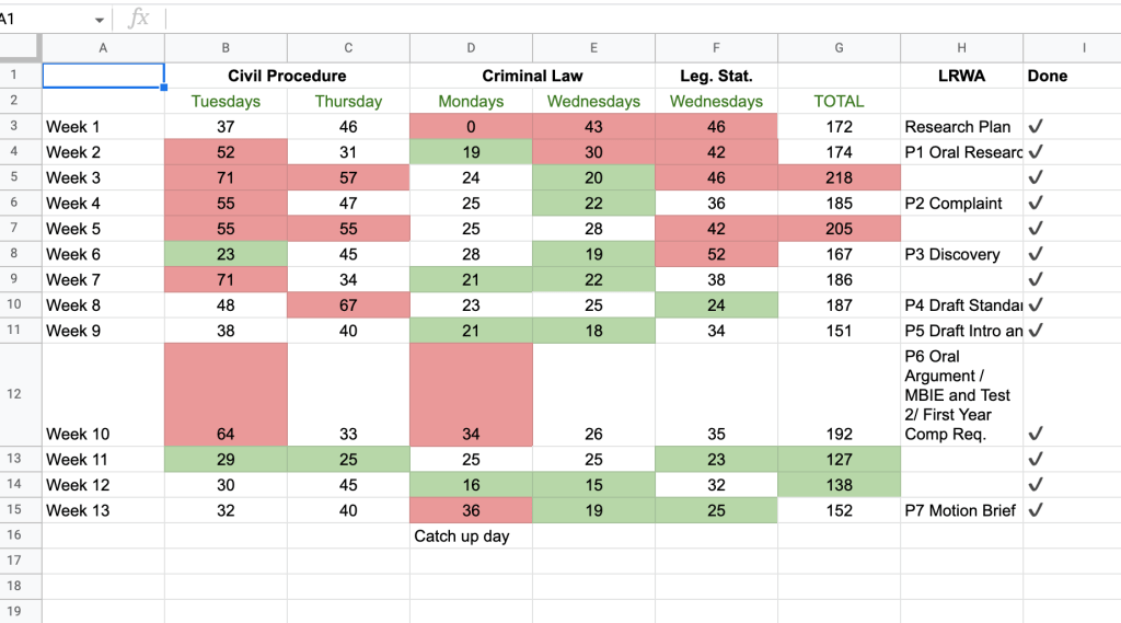 - Create a chart with how many pages of reading you have for each class: On a similar note, I found it very helpful the second semester to have a chart with the pages required for each reading. This allows you to know which weeks will be the hardest and plan your life accordingly.
