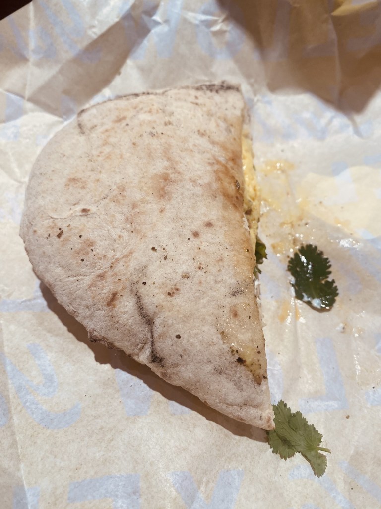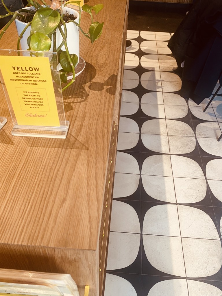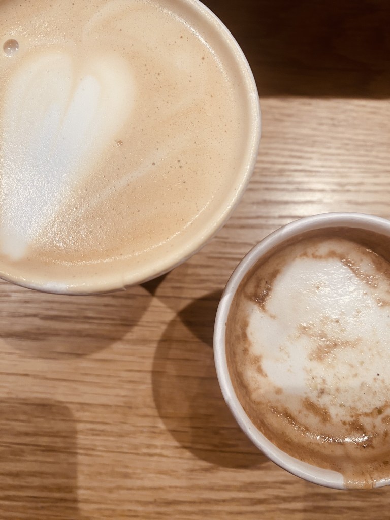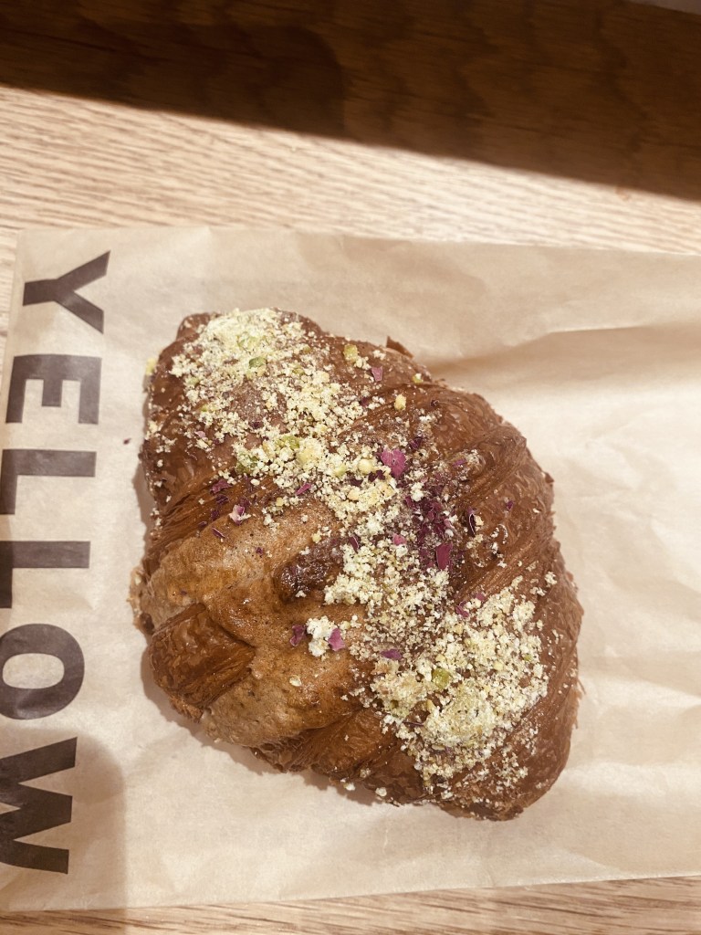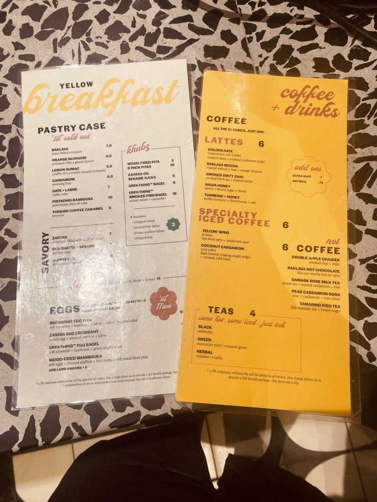 Once we made our way up to the front of the line, we ordered a lemon sumac cruffin, a twice baked baklava croissant, and two breakfast egg pitas to munch on. We ordered coffee, of course, in the form of a halva honey latte and a golden date cappuccino with oat milk. It was on the pricier side (see menu below).